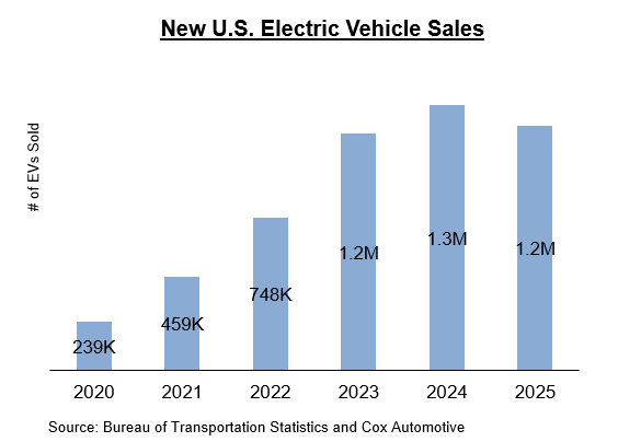 Adoption of electric vehicles is viewed as a negative for the automotive aftermarket because of their simpler maintenance needs and lower maintenance costs. While EVs have seen strong sales growth in recent years, the U.S. car parc will remain dominated by internal combustion engine (ICE) vehicles for the foreseeable future. EV sales in 2025 were down 2% from 2024, marking the first YoY decline since 2019.5