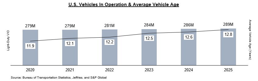 Vehicles aged between 4 to 11 years are the sweet spot for aftermarket parts and repairs spending – they have aged out of OEM warranties but still have sufficient lifespan remaining to justify consumers investing in maintenance. The number of vehicles in this sweet spot has grown at a CAGR of ~5% so far this decade to reach ~119M in 2025. In 2025, the average age of light-duty vehicles was 12.8 years – an increase of ~4 months since 2023.2