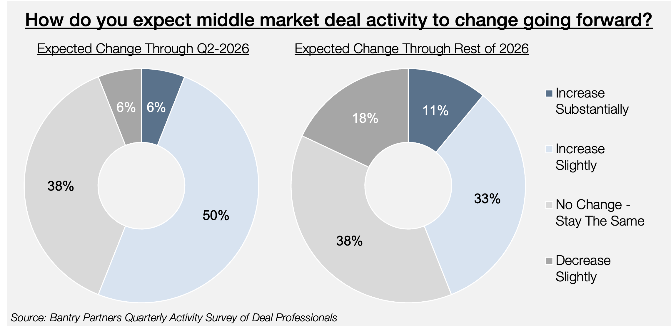 As mentioned in Bantry Partners' Q1 summary of middle market deal activity, prior downturns in the middle market, the 2009 financial crisis, and the 2022 COVID pandemic shutdown were followed by sharp recoveries that led to sustained higher levels of deal activity. Going into 2026, few deal professionals in our survey expected to see a spike in deal activity.