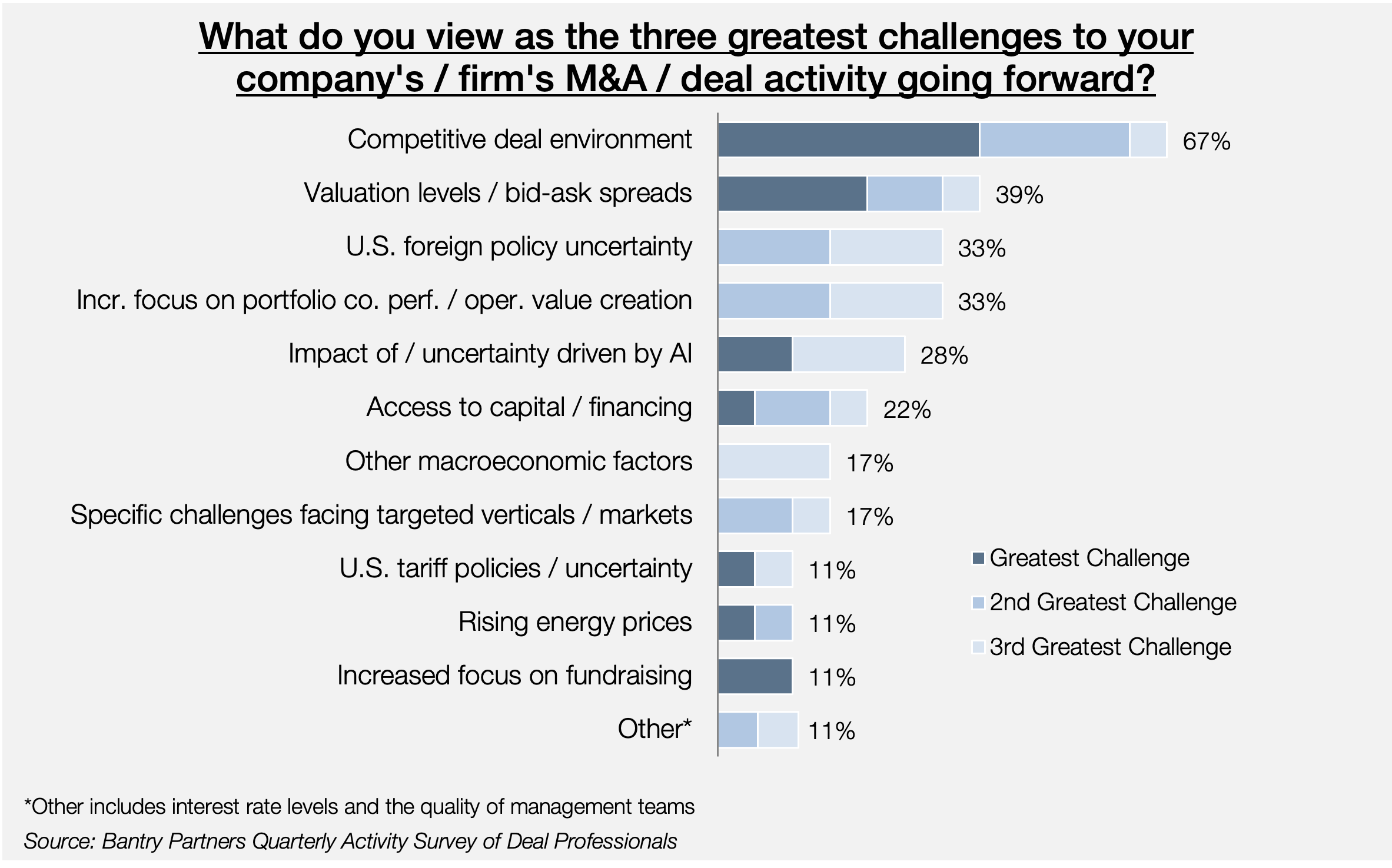 Views on the other top challenges facing the market include some valuation levels that have yet to adjust to the changing market, and an increased focus on portfolio company value creation. But uncertainty is on the minds of many deal professionals - the impact of AI, access to financing, U.S. trade / tariff policies, and, of course, the Iran War and other U.S. foreign policy decisions present a wide range of challenges for investors.