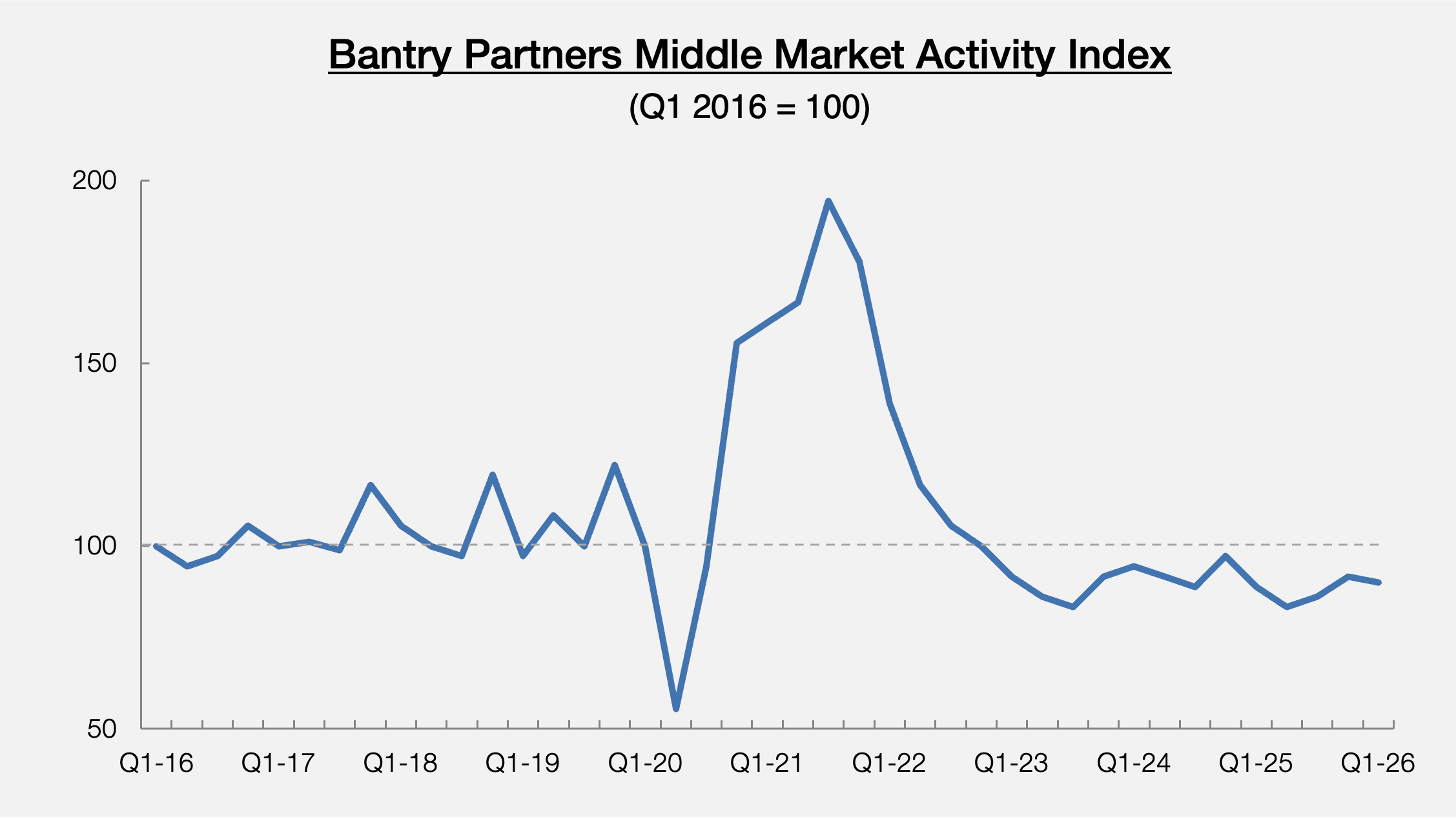 As a result, most of the 50+ professionals in Bantry Partners’ Q1-26 Market Activity Survey report that deal activity remained the same (44% of deal professionals) or was slightly down (28%) since Q4 of 2025. Bantry Partners' Middle Market Activity Index reflects these sentiments and reflects what we believe was a slight decline in deal activity in the first quarter of 2026.