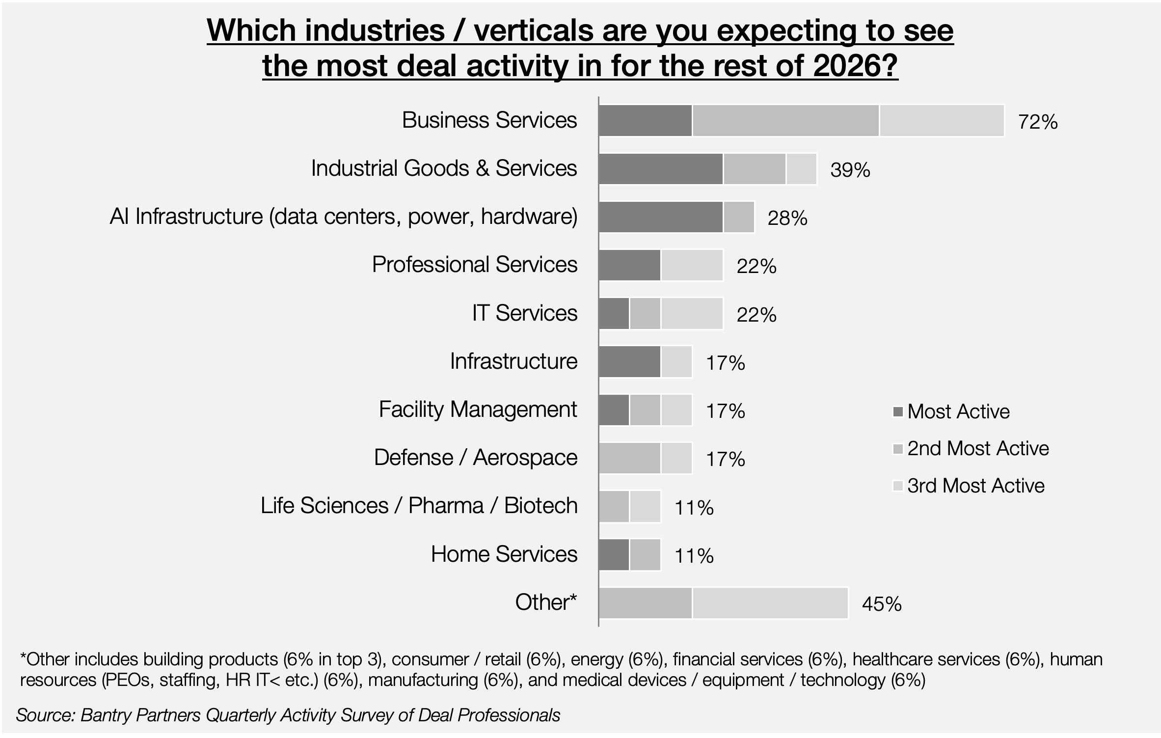 Nearly three-quarters of deal professionals in Bantry's survey expect the business services sector to realize the most deal activity through the rest of the year.